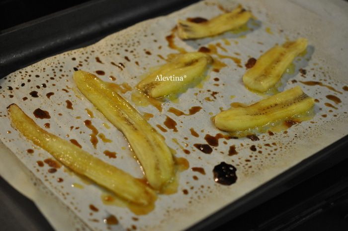 Приготовим банановые дольки. Разрежем банан на тонкие пластинки аккуратно, выложим на противень с бумагой для выпечки. Сверху банановых долек выложим сахар и масло. Поставим в духовку на 5 мин.в режим бройл или в духовку на 200 гр.
