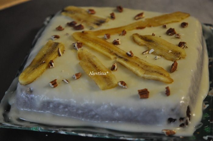Выложим дольки поверх сахарной глазури, посыпаем орехами. Разрезаем и подаем к столу. Приятного аппетита.