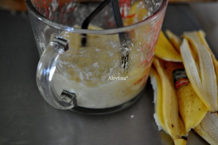 Бананы спелые раздавить в пюре. Добавить пюре в масляную смесь и перемешать на медленной скорости.