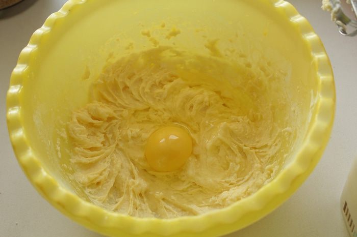 Взбиваем сливочное масло с сахаром до кремового состояния. Добавляем ванилин. Затем яйца по одному, продолжая взбивать.