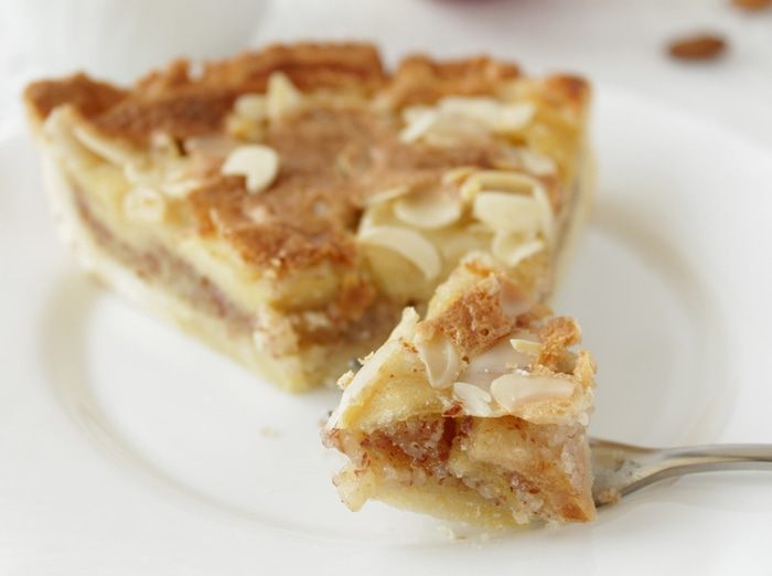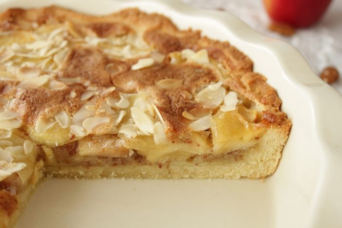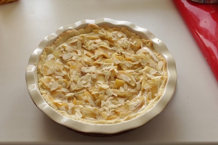 Сверху выкладываем яблоки, присыпаем миндальными лепестками.