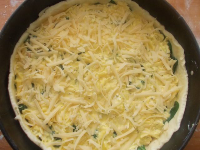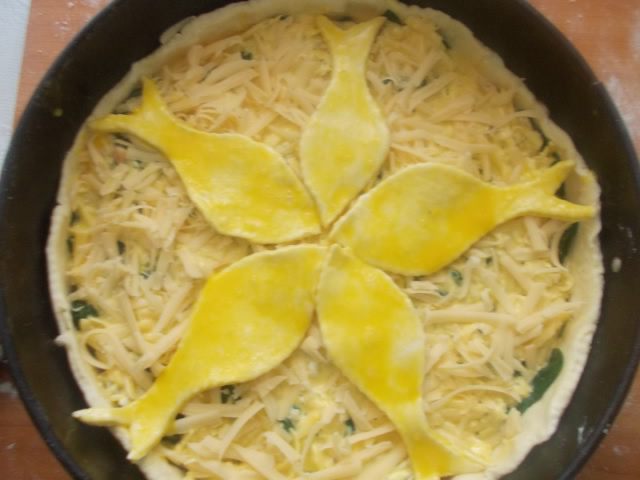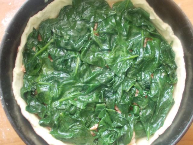 Укладываем листики шпината для красоты и отправляем в разогретую духовку 200С. на 35-40 минут, пока киш не станет золотистым. Он хорош, как горячим, так и холодным. Приятного аппетита!!!