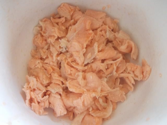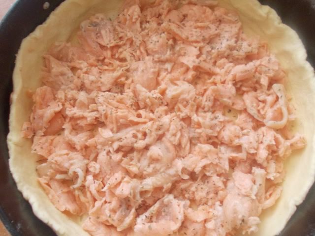 Семгу порезать и залить кипятком, оставить на пару минут и слить воду, разобрать на крупные волокна и посолить. Так она не даст много сока при запекании и пирог не станет раскисшим.