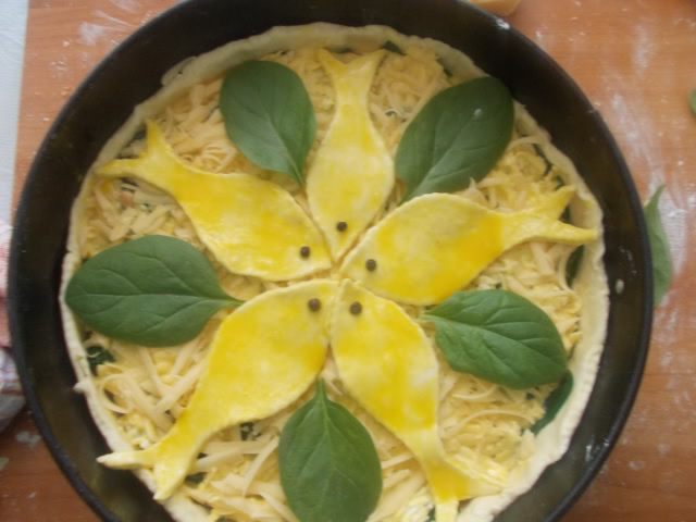 Из обрезков теста,я вырезала рыбок и обмакнула в яйце,глазки сделала из перца.