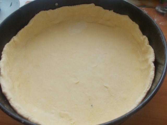 Тесто раскатать тонко и выложить в форму, сделав бортики.