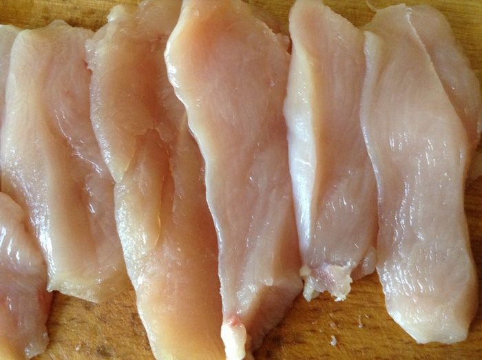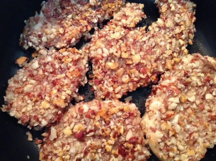 А теперь самое важное - необходимо обвалять этот кусочек в арахисе так, чтобы орехи хорошенько прилипли к мясу (для этого надо кусочек как бы "вдавить" в арахис) сначала с одной, а потом с другой стороны. И лучше подготовить таким образом все мясо, потому что жарится оно очень быстро.