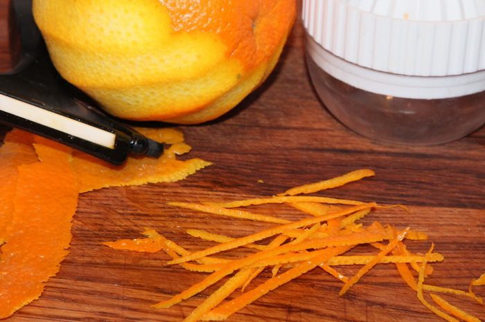 В это время снимаем с половины апельсина цедру. У кого есть специальное приспособление - замечательно! У меня нет, поэтому я снимаю ножиком для чистки овощей, а затем острым ножом нарезаю тоненькие полосочки. Главное, снять только верхний слой - без мягкого белого слоя. Из апельсина добываем любым способом 100 мл сока.