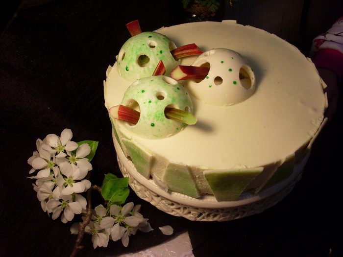 Поэтому на конкурс французской кухни я приготовила торт "Баядерка", который покорил необыкновенным сочетанием сочного бисквита, пропитанного маракуйей, начинки из ревеня (да-да, нашего родного, дачного чуда) и сливочного мусса на белом шоколаде с ароматом лаймовой цедры.