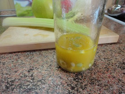 1. Приготовить заправку: лук мелко нарезать, чеснок измельчить. Все выложить в баночку. Добавить соль, перец, яблочный уксус и оливковое масло. Все содержимое перемешать потряхиванием, отставить и заняться салатом.