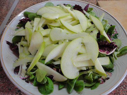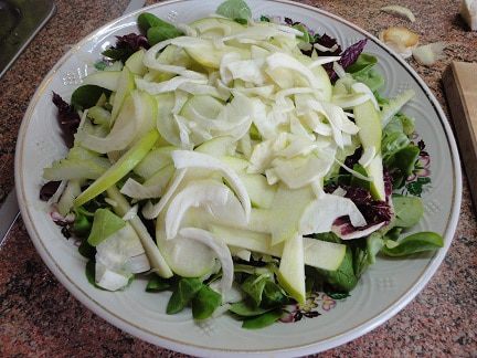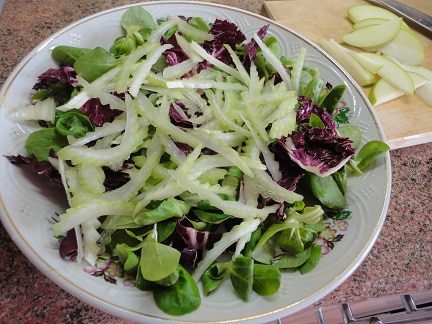 3. Сельдерей, яблоко (у меня было Гренни Смит – с ароматом свежести и кислинкой), и фенхель нарезала тонкими «лепестками» и уложила слоями в таком же порядке: сельдерей,