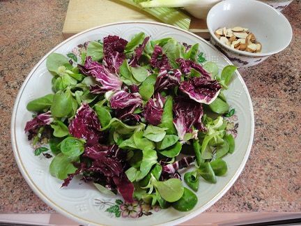 2. В море зеленых витаминов не только для красоты, но и для горчичного вкуса я решила добавить немного таких красивых листьев салата радичио.