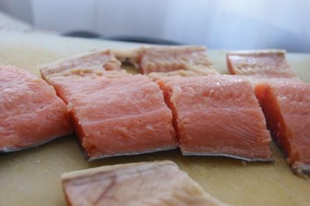 Филе кеты порезать кусочками, посолить.