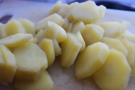 Картофель сварить до полуготовности, порезать кружочками.