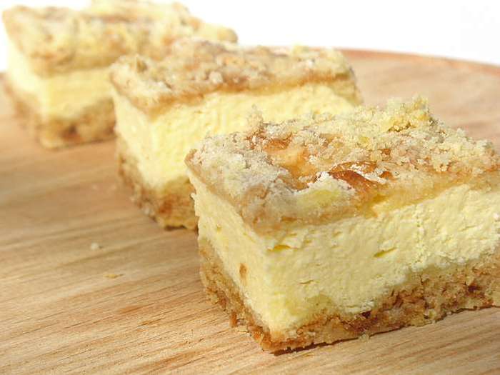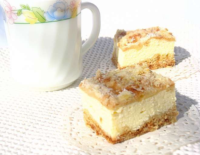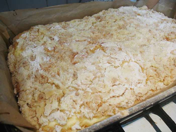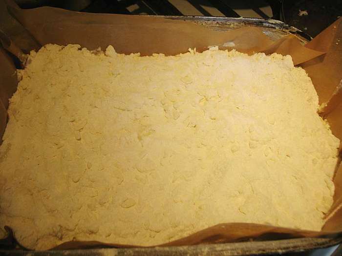 Форму (у меня она размером 19х27) застелить пергаментом, можно это и не делать, но так потом удобнее достать творожник и нарезать его на кусочки. На дно высыпаем 2/3 теста, приминать не надо!!! На крошку выкладываем творог и разравниваем. На творог равномерно высыпаем оставшуюся крошку.