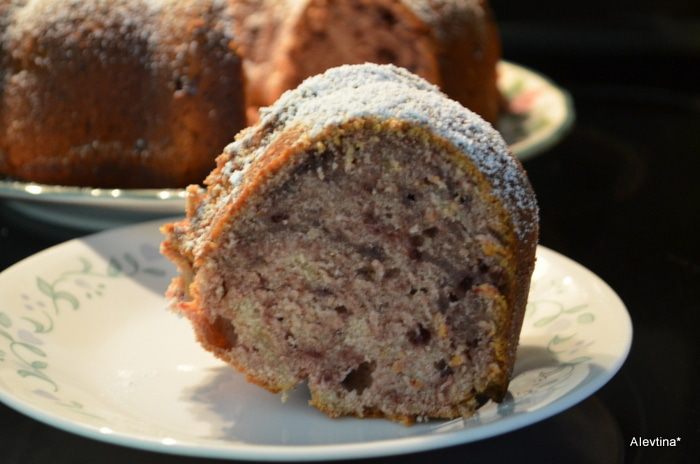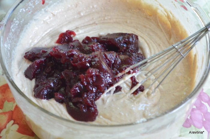 Смешать муку и 4 следующих ингредиента, как 1 1/2 ч.л корица ,1 ч.л молотый душистый горошек, 3/4 ч.л молотая гвоздика специя ,1/2 ч.л соль . Затем добавить кефирную смесь и масляную, перемешать в ручную. Соскребаем со стенок также. Добавим ежевичный джем и также медленно перемешаем.