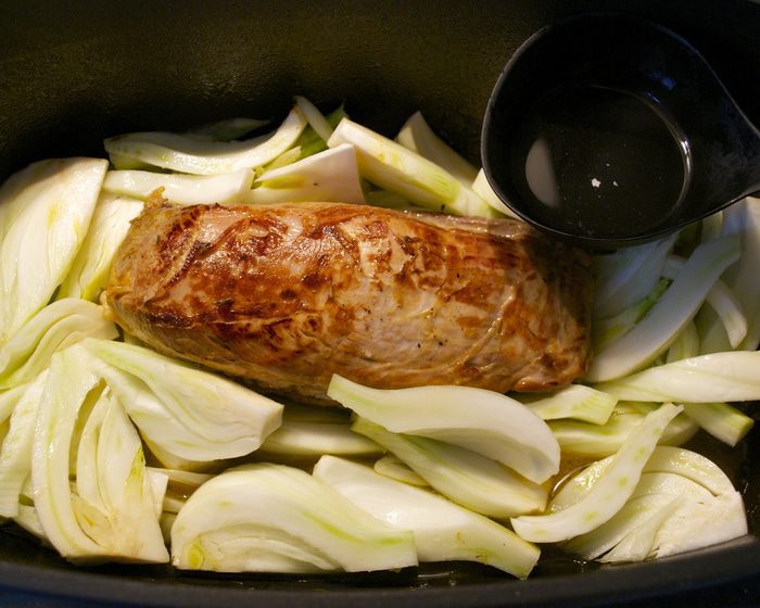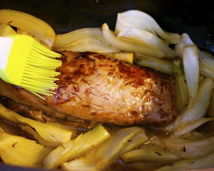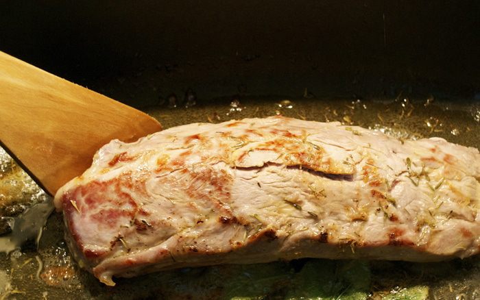 В глубокой сковороде с тяжелым дном растопить масло и добавить ароматические травки (шалфей, тимьян). Филе достать из маринада и обсушить бумажным полотенцем. Обжарить на сильном огне в течение 6-7 минут с каждой стороны, чтобы мясо приобрело золотистый цвет.