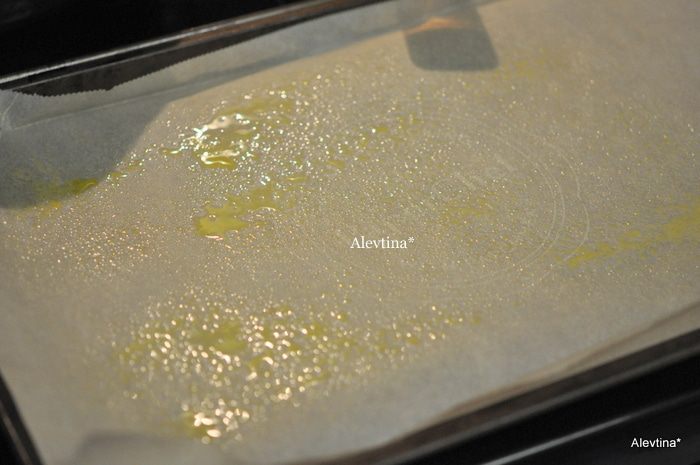 Разогреть духовку до 180 гр. Смазать противень маслом, застелить бумагой для выпечки и смазать по верху. Так легче снимать будет рулет яичный.