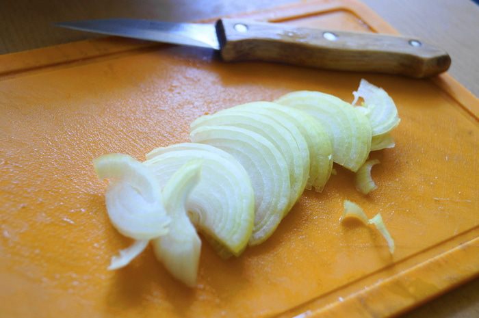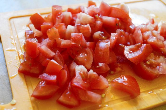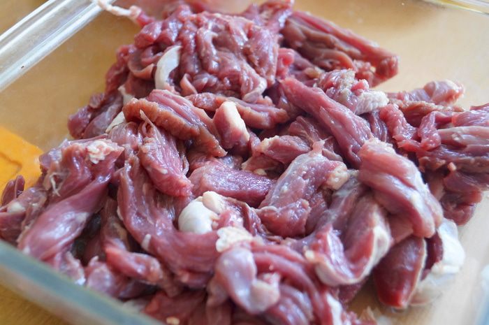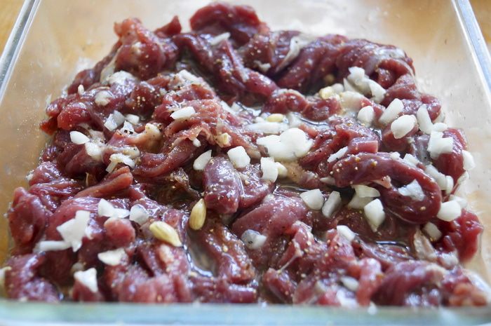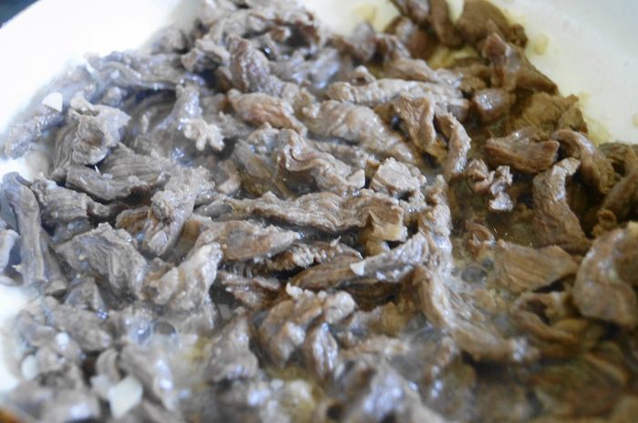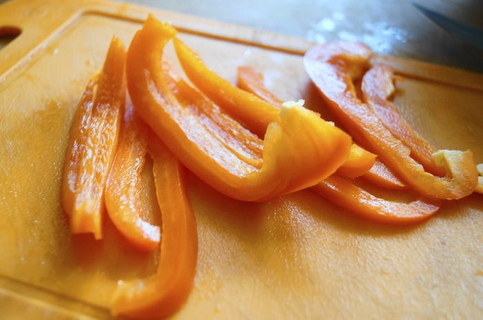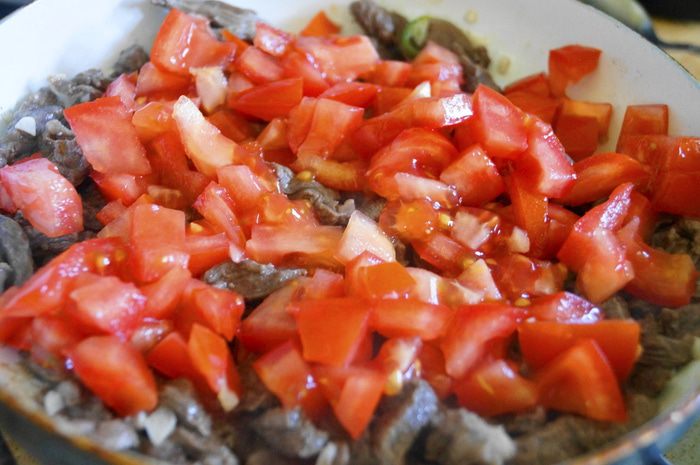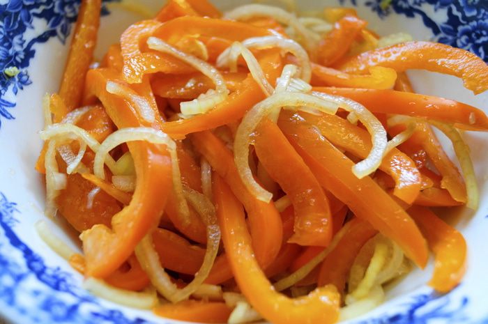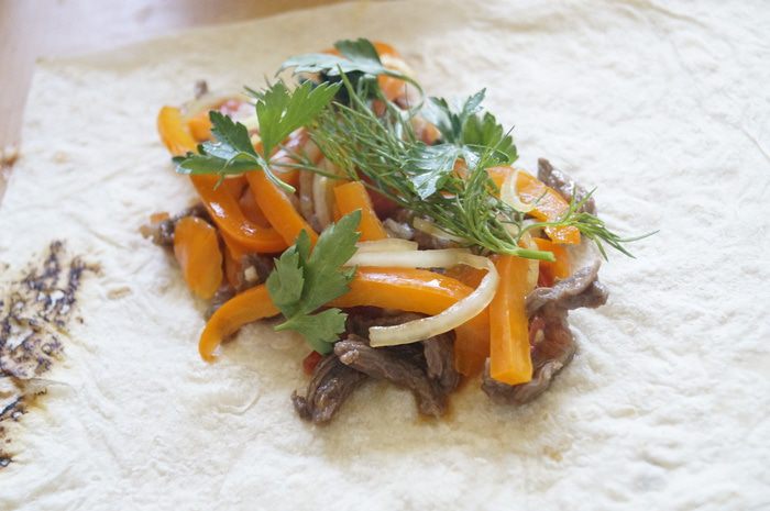 Теперь приступим к сборке. У меня был магазинный лаваш (можно конечно и дома приготовить). Режем его на несколько частей, так чтобы можно было завернуть его. Выкладываем на лаваш тушеное мясо с помидорами, а сверху маринованный болгарский перец и репчатый лук, сверху добавляем зелень.