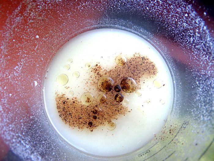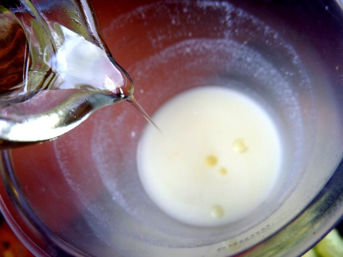 Наливаем в чашу для взбивания кефир или йогурт,капнем оливкового масла.