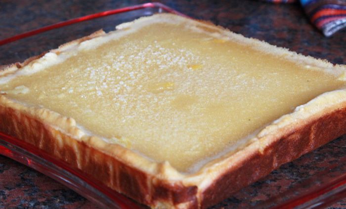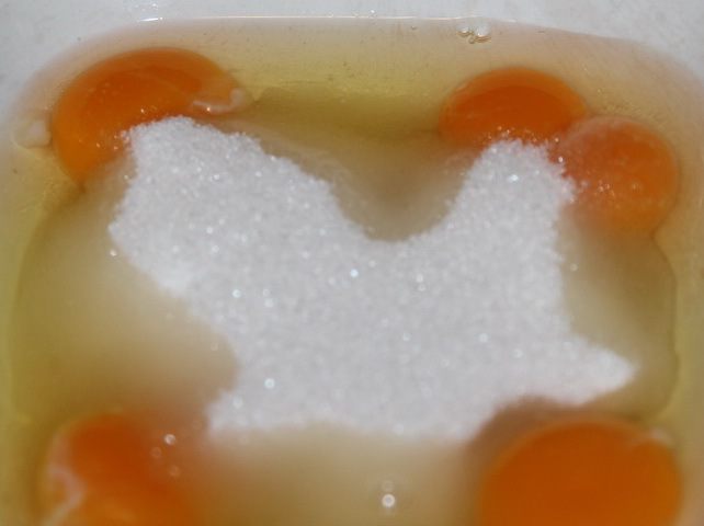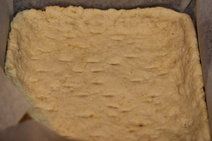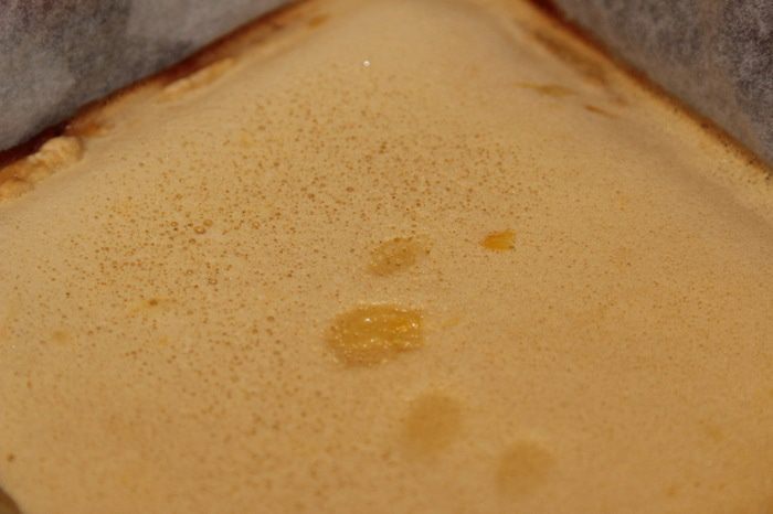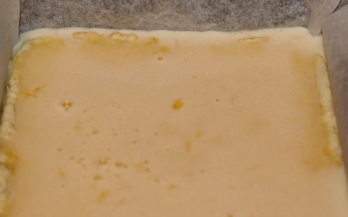 Вынимаем из духовки и сразу выливаем лимонно-яичную смесь. Если вы вытащите корж раньше, чем сделаете крем, он остынет и отделится от бумаги, а когда вы выльете крем и его окажется больше, чем смогут удержать бортики, корж всплывет и все труды насмарку (у меня так было)... . А если будете лить на горячий корж и крема окажется больше - не беда! Все будет хорошо, все пропечется и будет красиво. У меня в этот раз тоже крема оказалось немного больше чем нужно, но я уже этого не боюсь. Я делаю крема столько, чтобы слой был толстенький: мы так любим. В общем - выливаем крем в противень.