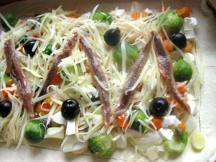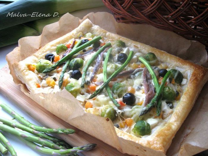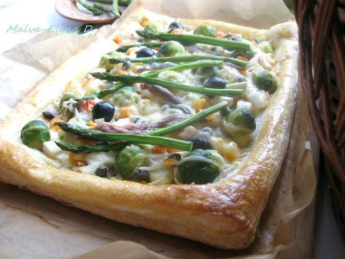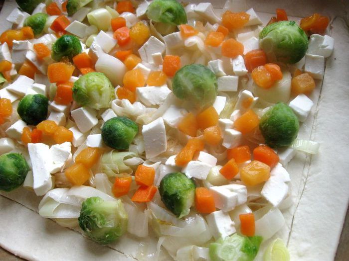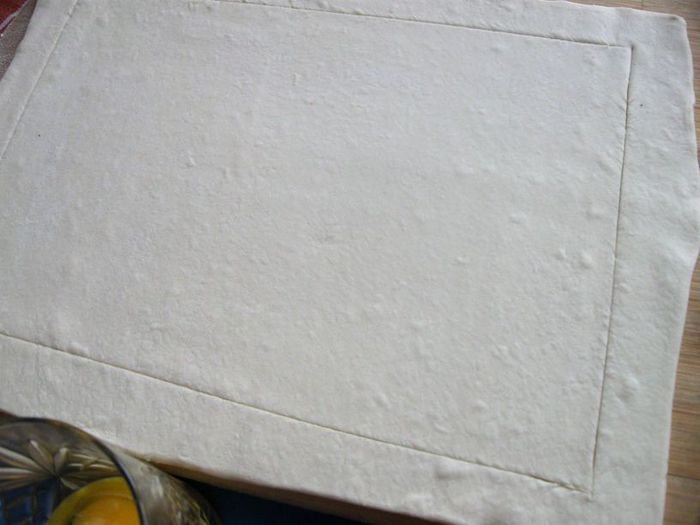 Тесто вынуть из морозильной камеры, разморозить, раскатать по размеру прямоугольной формы с низкими бортами (у меня форма 24 Х 32), острым ножом по периметру на расстоянии 2,5 – 3 см сделать разрез не на всю глубину слоя теста, чтобы бортики теста во время выпечки могли подняться. Форму застелить бумагой для выпечки, положить тесто.