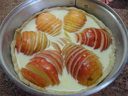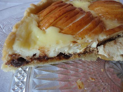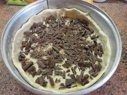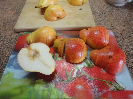 Груши разрезать на половинки, удалить серединку и нарезать каждую половинку поперек на тонкие ломтики, сохраняя форму половины груши. Шоколад порубить ножом.