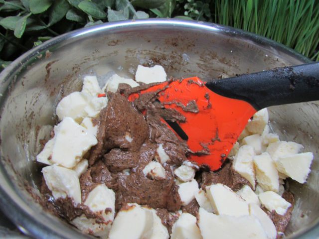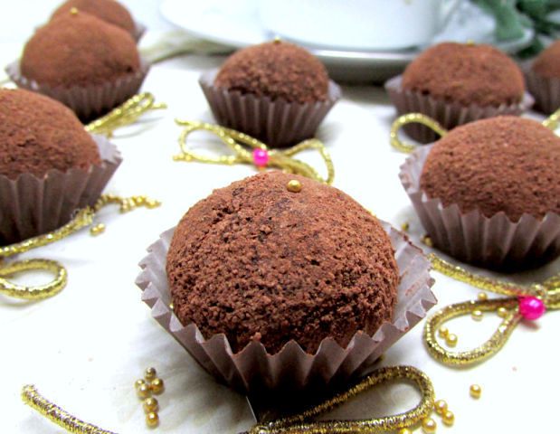 Теперь можно брать кусочки чайной ложечкой и руками формовать шарики, которые затем запанировать в какао-порошке. Лучше, если руки во время этой операции будут холодными, также удобно использовать тонкие латексные перчатки. Чтобы избежать таяния шоколадной массы в руках, можно положить чайные ложки в морозилку, доставать ими ганаш и сразу же бросать в миску с какао, обваливать и потом катать шарики - так получается очень ровно и не липнет к рукам.
