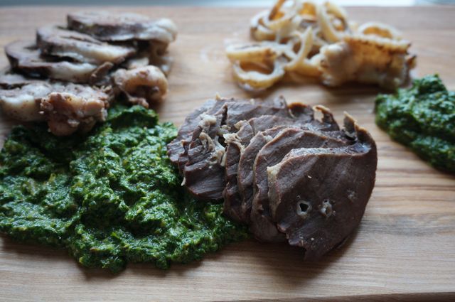 Добавить оливковое масло (можно больше, если хотите, чтобы соус лился), посолить по вкусу (слегка). Подавать к мясу или овощам. Здесь бараньи потроха (предварительно их просто отварили, даже без соли). Приятного аппетита!