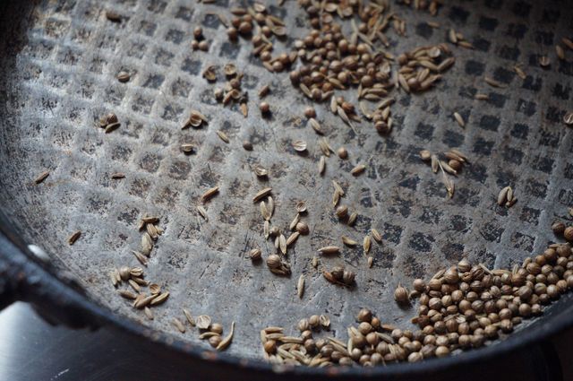 Кориандр, зиру (и кардамон, если целый - раздавить предварительно тыльной стороной ножа) обжарить в течении нескольких минут на сухой сковороде (запах после этого будет неимоверный).