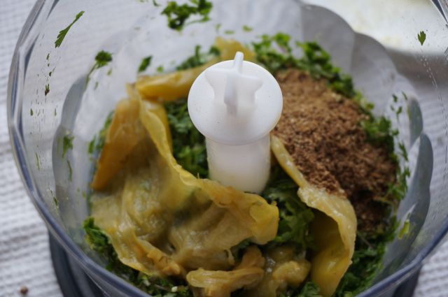 Перчик избавить от семечек и плодоножки, добавить к зелени вместе со специями и еще раз измельчить все в блендере.