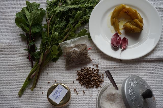 Набор продуктов. Большой пучок кинзы (на фото половина), 3 маленьких веточки мяты, перец маринованый острый (!), кардамон я у себя нашла только молотый, хотя лучше было бы взять 0,5-1 стручок и готовить его с остальными зернами.