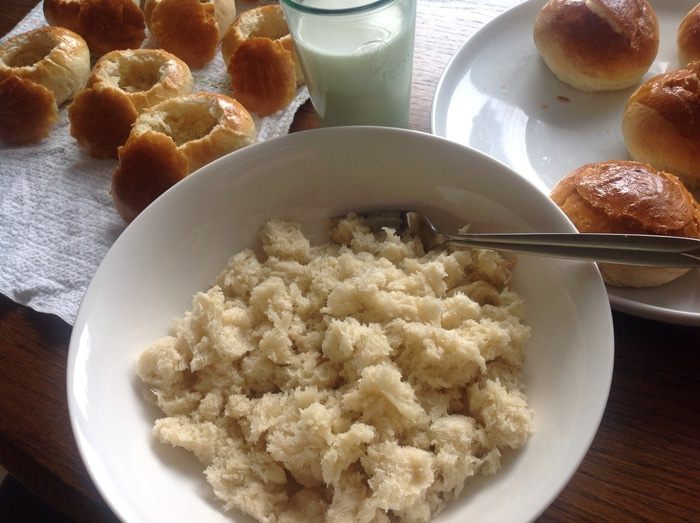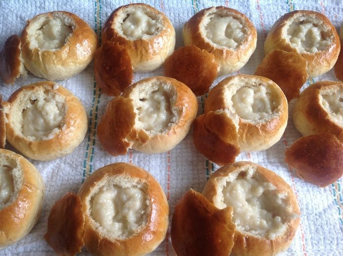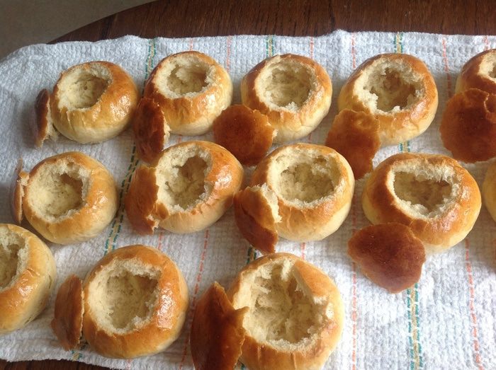 Теперь самое интересное!))) Булочки остудить и аккуратно срезать сверху крышечку и вынуть ,как говорят шведы,булочные потрошка)))я это делала чайной ложкой...тесто нежное и очень легкое....