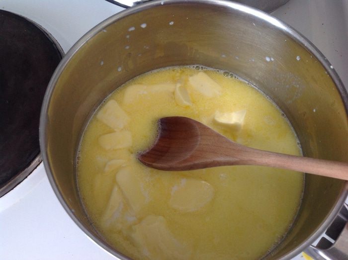 В кастрюльке растопить масло и добавить молоко ....нагреть ...примерно до 37-40 градусов.