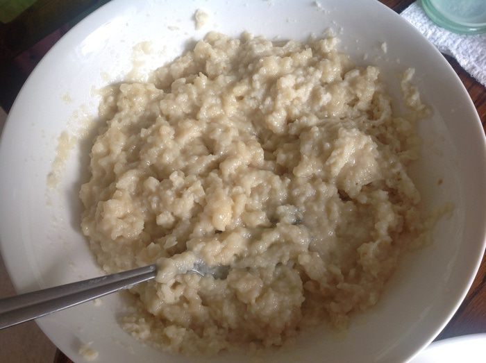 Делаем миндальную пасту для начинки: Всю сердцевинку из булочек сложить в миску и залить теплым молоком (200 мл)....размять вилкой ...