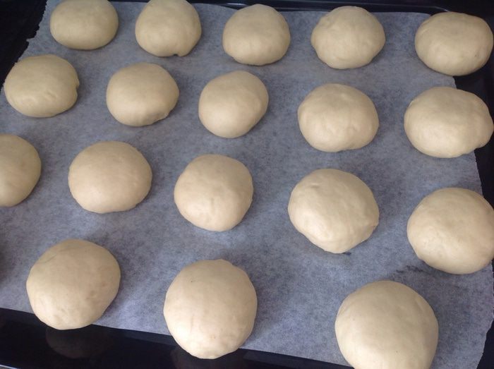 Тесто разделить на 18 частей. Я воспользовалась весами....что бы булочки вышли идеально одинаковые....у меня получилось в этот раз 19 булочек(кусочек теста весил 60 г)конечно я не вымеряла до грамма))),но старалась близко...)))