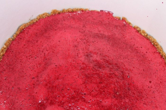 Достаем из холодильника застывший корж и выливаем на него желе. Убираем в морозилку на 30 минут.