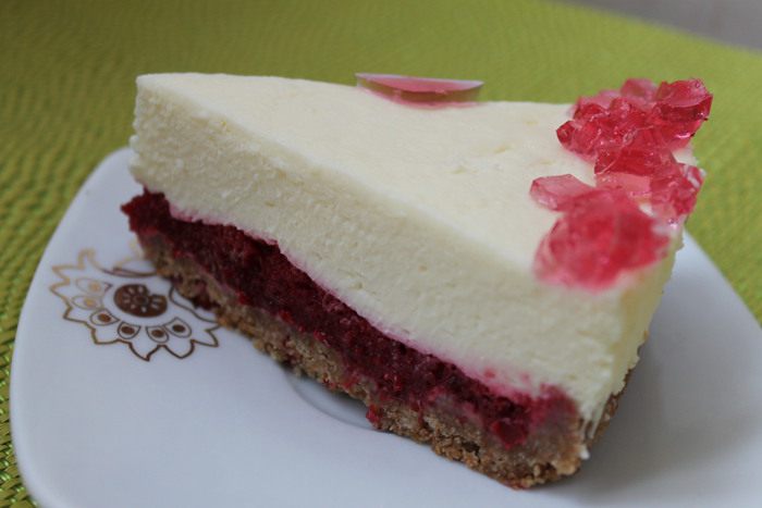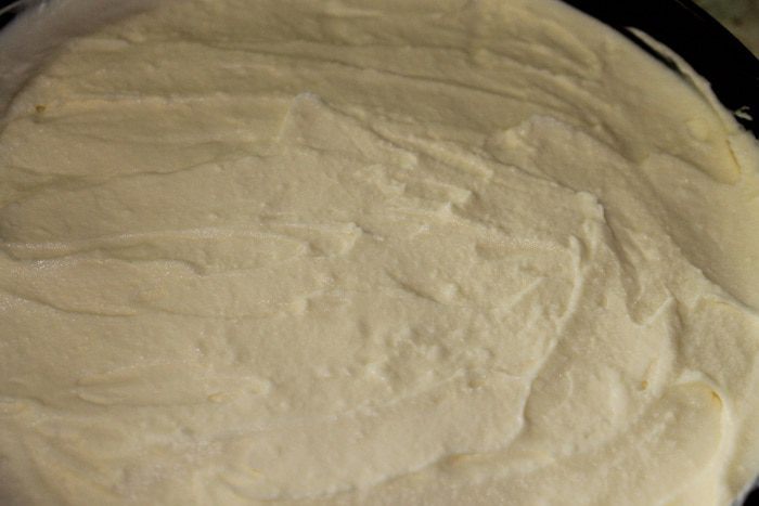 Достаем корж с желе из морозилки, выкладываем получившийся крем и убираем опять в морозилку на 30 минут.