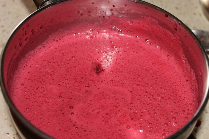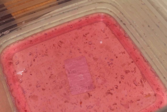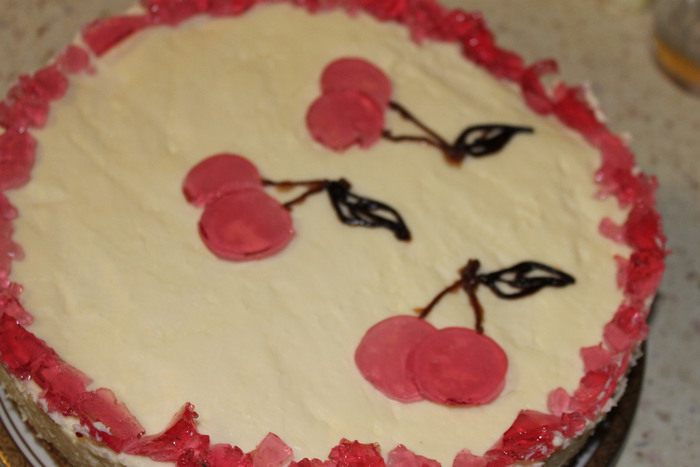 Для украшения, пакетик готового вишневого желе залить горячей водой, хорошо перемешать и вылить в контейнер. Убрать в холодильник на 30 минут.