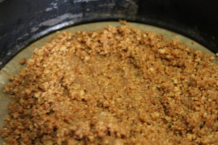 Печенье измельчить в блендере в крошку, добавить растопленное сливочное масло. Хорошо все перемешать и выложить в форму, плотно утрамбовать руками, делая бортики 2 см. Убрать в холодильник на 30 минут.