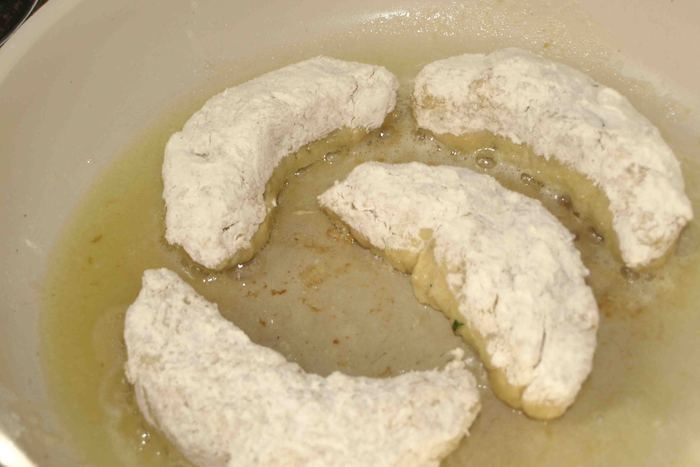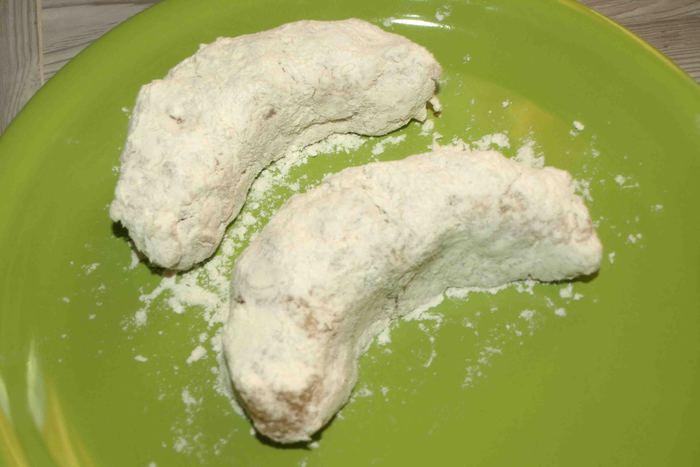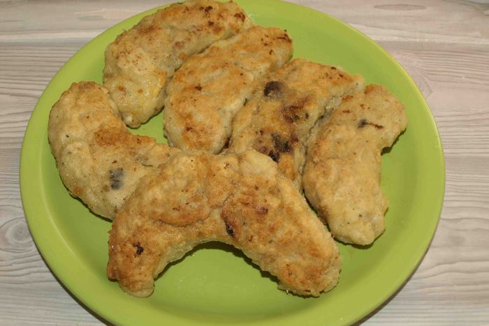 Формируем котлету-полумесяц (можно и просто котлеты), обваливаем в муке или панировочных сухарях, предварительно смочив яйцом.