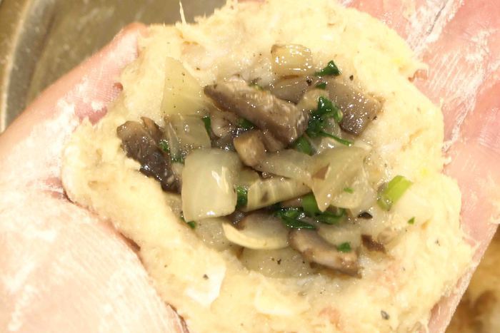 Руки смочить водой или растительным маслом, или припудрить мукой. Формируем из фарша лепешку. Добавляем начинку, защипываем.