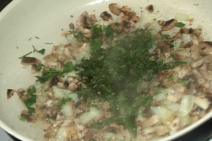 Первым делом готовим начинку. Лук, грибы, зелень нашинковать. Нагреть сковороду, налить в нее растительное масло и обжарить лук. Добавить к луку грибы. Обжарить все вместе, добавить зелень, соль, перец.