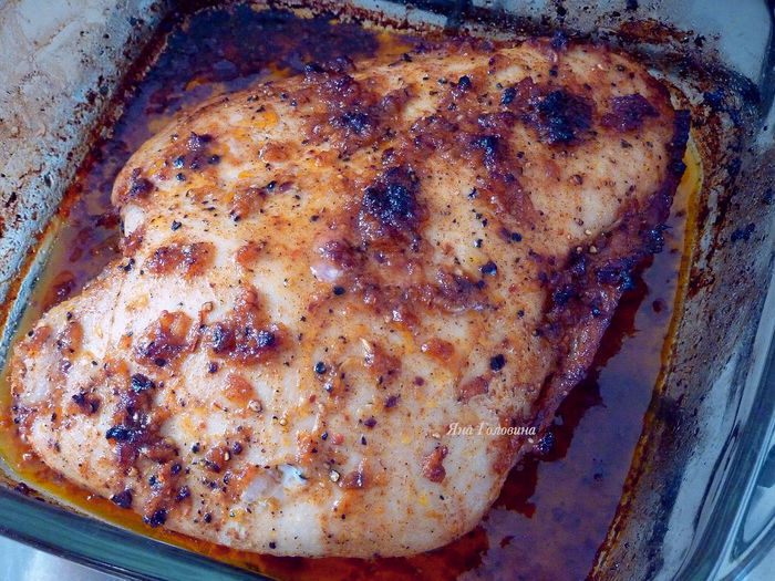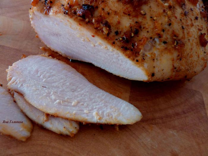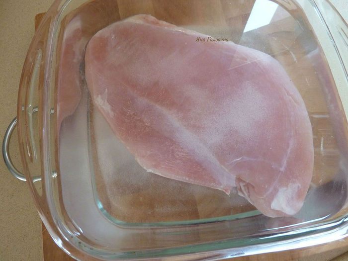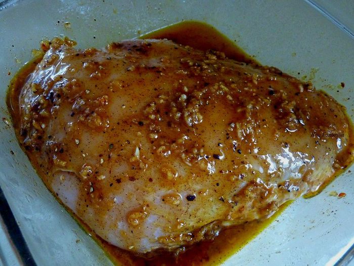 Слить воду и хорошо промазать грудку маринадом со всех сторон.