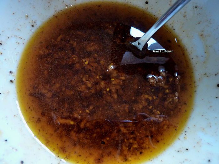 В миске перемешать оливковое масло, паприку, черный перец, выдавленный чеснок и мёд.