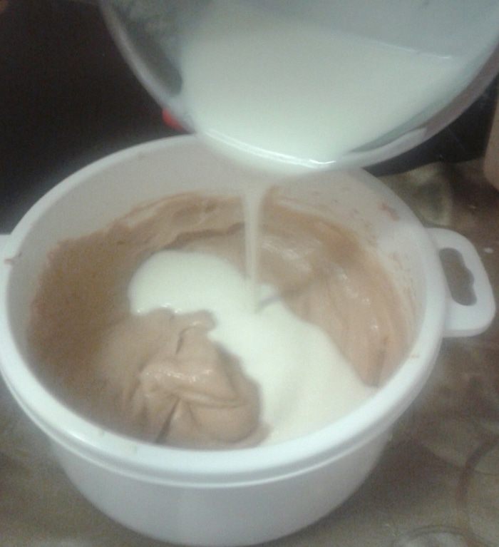 Затем взбить, добавляя к творогу вареное сгущенное молоко небольшими порциями (немного сгущенного молока оставить для украшения).