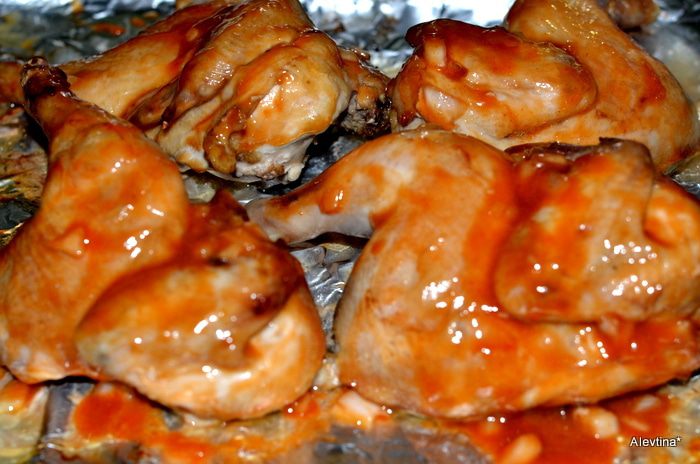 Выложить птицу на гриль стороной, где кожица, смазав кисточкой соусом со всех сторон. Готовим до полной готовности. Прикрываем сверху фольгой, чтоб не сгорела.
