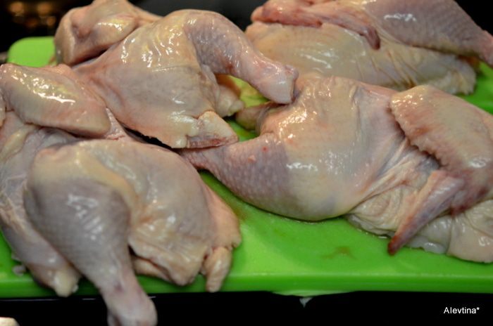 Разрежем птицу молодую или цыплят на 2 части. У меня 2 тушки небольшие. Посолим и поперчим.