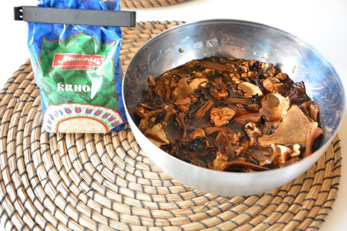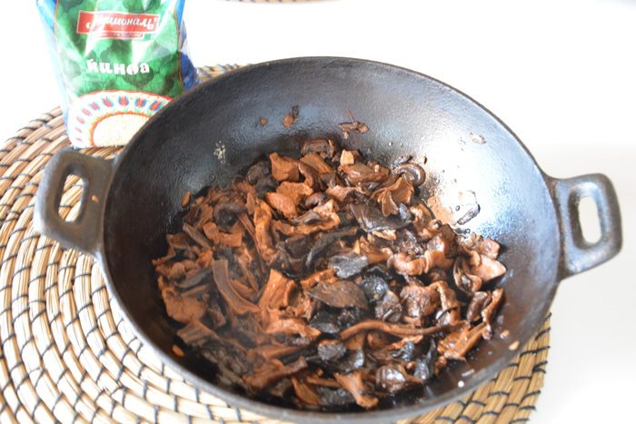 Грибы тушить в той же воде, в которой замачивались. Как только вода выпарится, добавить соль, перец, растительное масло и обжарить 5 минут.