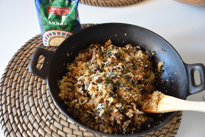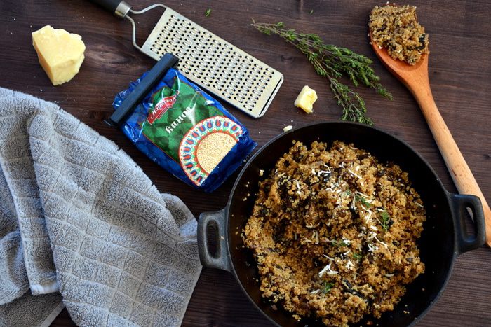 Добавить отварной киноа и перемешать. Натереть пармезан и посыпать тимьяном.