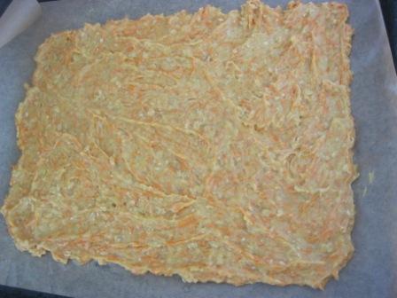 Застелить противень пергаментной бумагой, распределить тесто на противне тонким слоем.